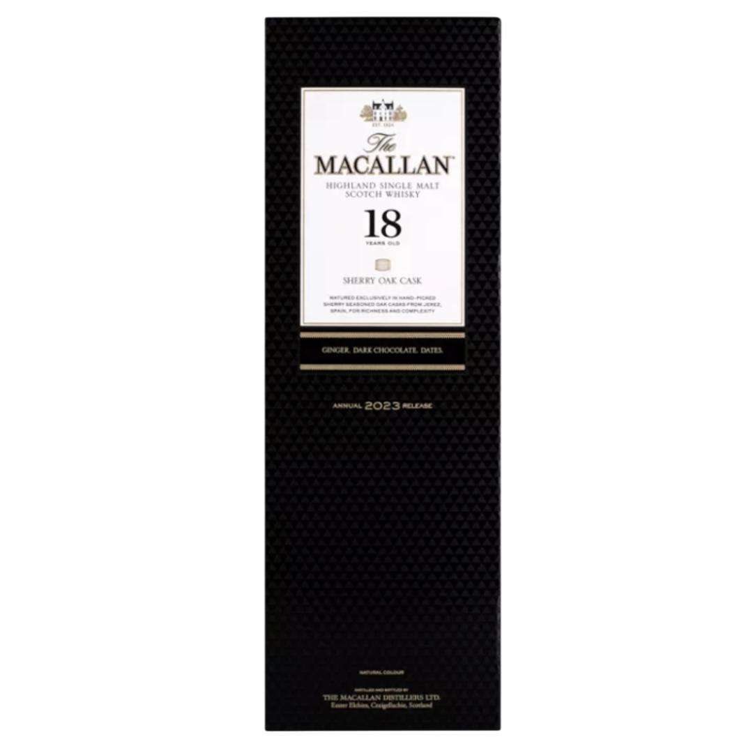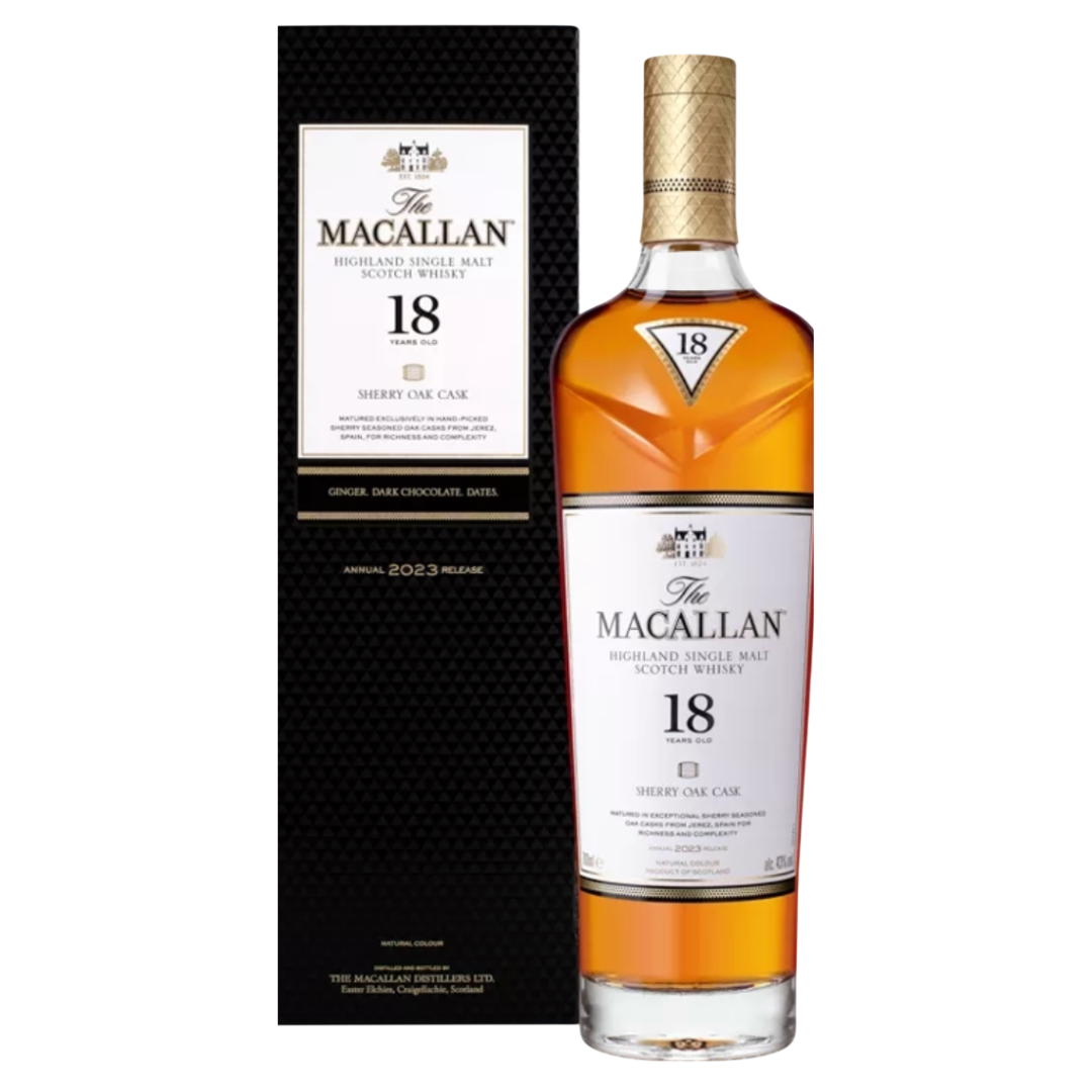 Macallan Sherry Oak 18 Years Old je vrhunski single malt škotski viski, koji predstavlja jedno od najprestižnijih izdanja destilerije Macallan. Ovaj viski sazreva punih 18 godina isključivo u ručno izrađenim hrastovim buradima od šerija iz Španije, što mu daje izuzetnu dubinu, kompleksnost i prepoznatljiv karakter.